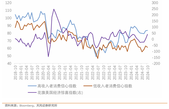 近期对“氛围零落”的究诘有所降温,但是不同收入组别下的破钞者信心建筑区别仍然显着。高收入者的破钞信心仍远高于中低收入者,且“外洋度假”这种可选破钞神气标信心建筑显着快于举座指数,证明了购买力的分化还在络续。