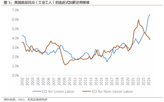 而低手段工作者有着更高的薪资增速。近一年来,好意思国歇工事件频发,终末皆以大幅加薪的形势驱散。昨年一度闹得沸沸扬扬的 UAW 汽车工东谈主歇工事件的惩办是时薪加多25%-68%并加多更多补贴;近期好意思国口岸工东谈主歇工事件则以高兴畴昔 6 年内加薪 62%而闪电完了。