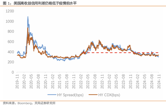近期歇业重组企业启动增多且杰出了疫情前的水平,伴跟着的是中小企业的信贷要求一经处于收紧区间。与此同期,好意思国高收益债利差(HY Spread)以致低于 2019 年底水平,对应的HY CDX也回到了2022年 3月加息启动时的水平,金融商场并未对中小企业的出息过度担忧。